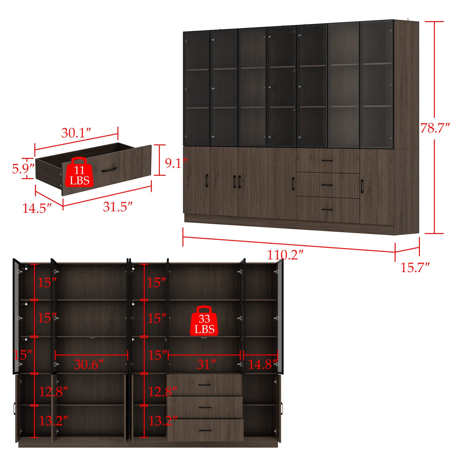 110.2'' W Glass Doors Display Case Curio Cabinet With Drawers ,Shelves,LED Lights