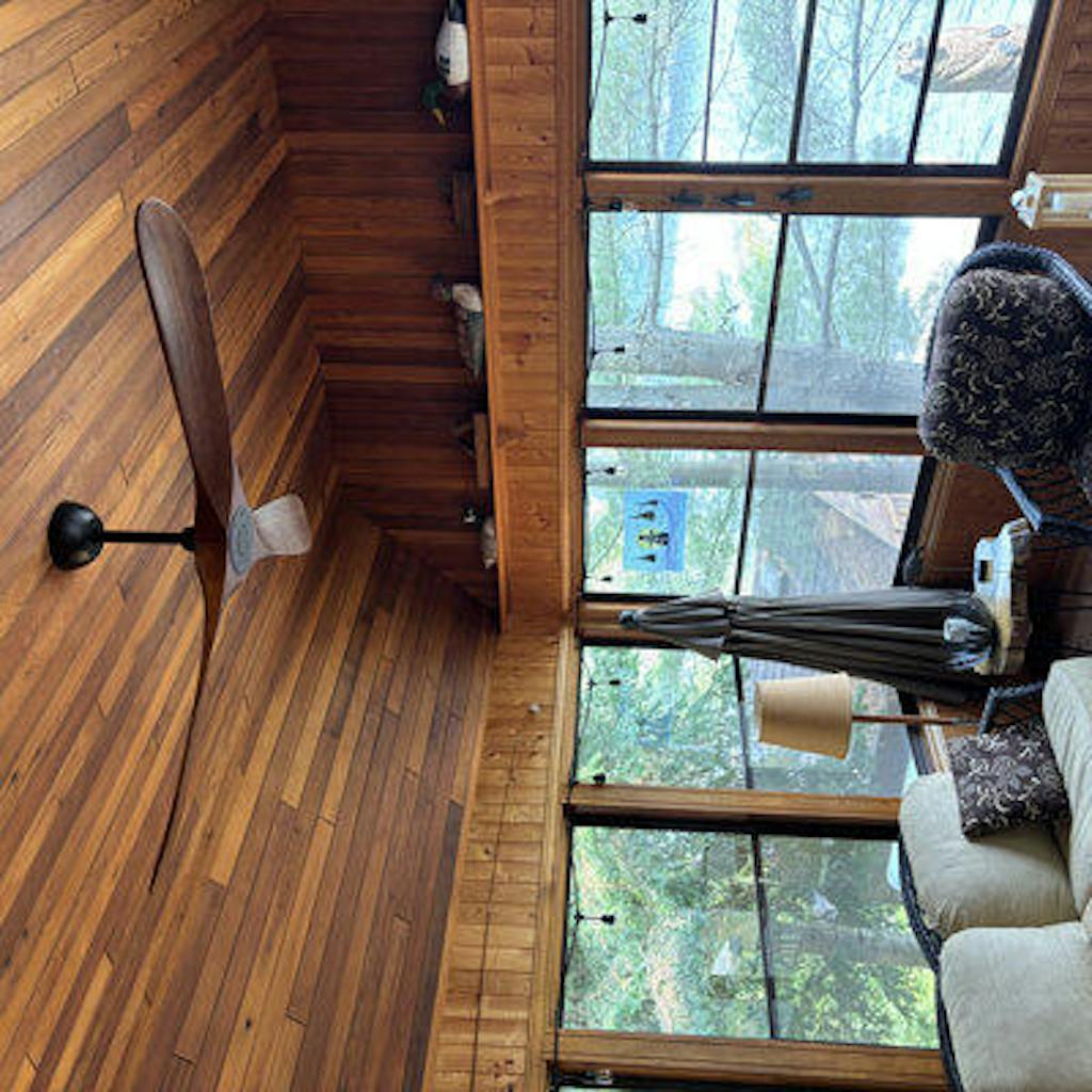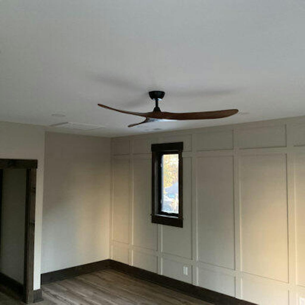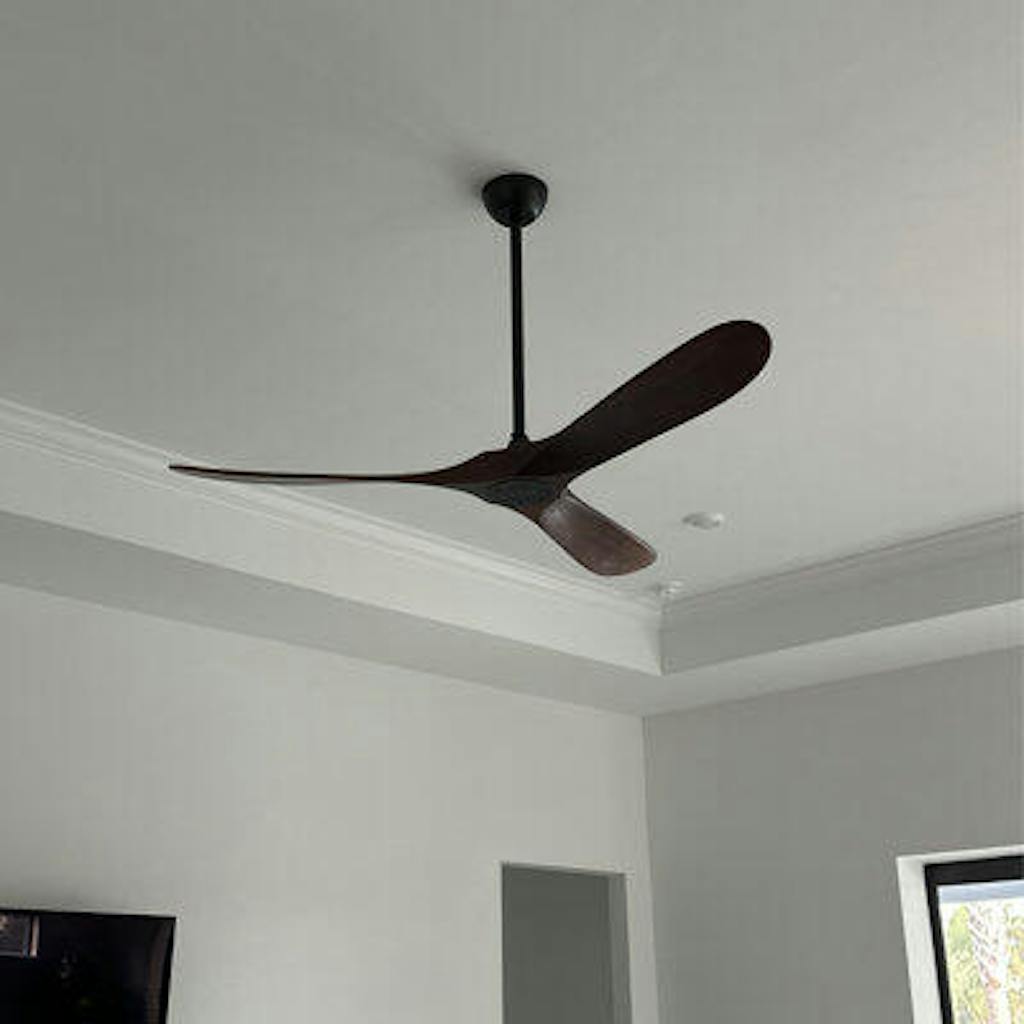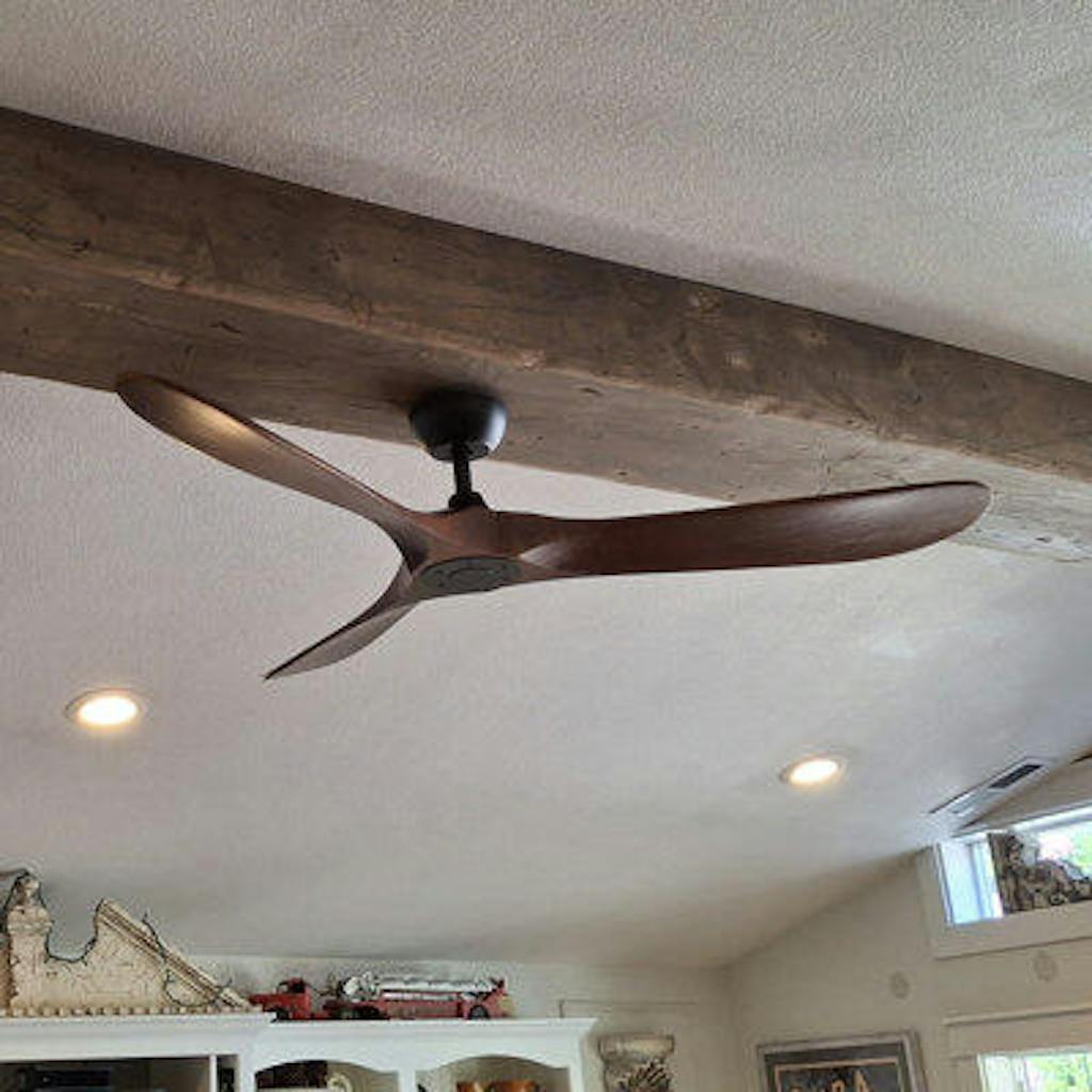 This 60” 3-blade propeller ceiling fan refreshes your living room, bedroom, or home office with a sleek modern style. We love that it’s compatible with a smart receiver (sold separately) so you can control its functions from your phone. It’s made of metal in a black finish and features a circular backplate, slim-down rod, and circular base unit. Three solid wood blades in a warm brown finish offer distinctive contrast. This fan has six speeds and a quiet reversible motor and is operable by its remote control.
