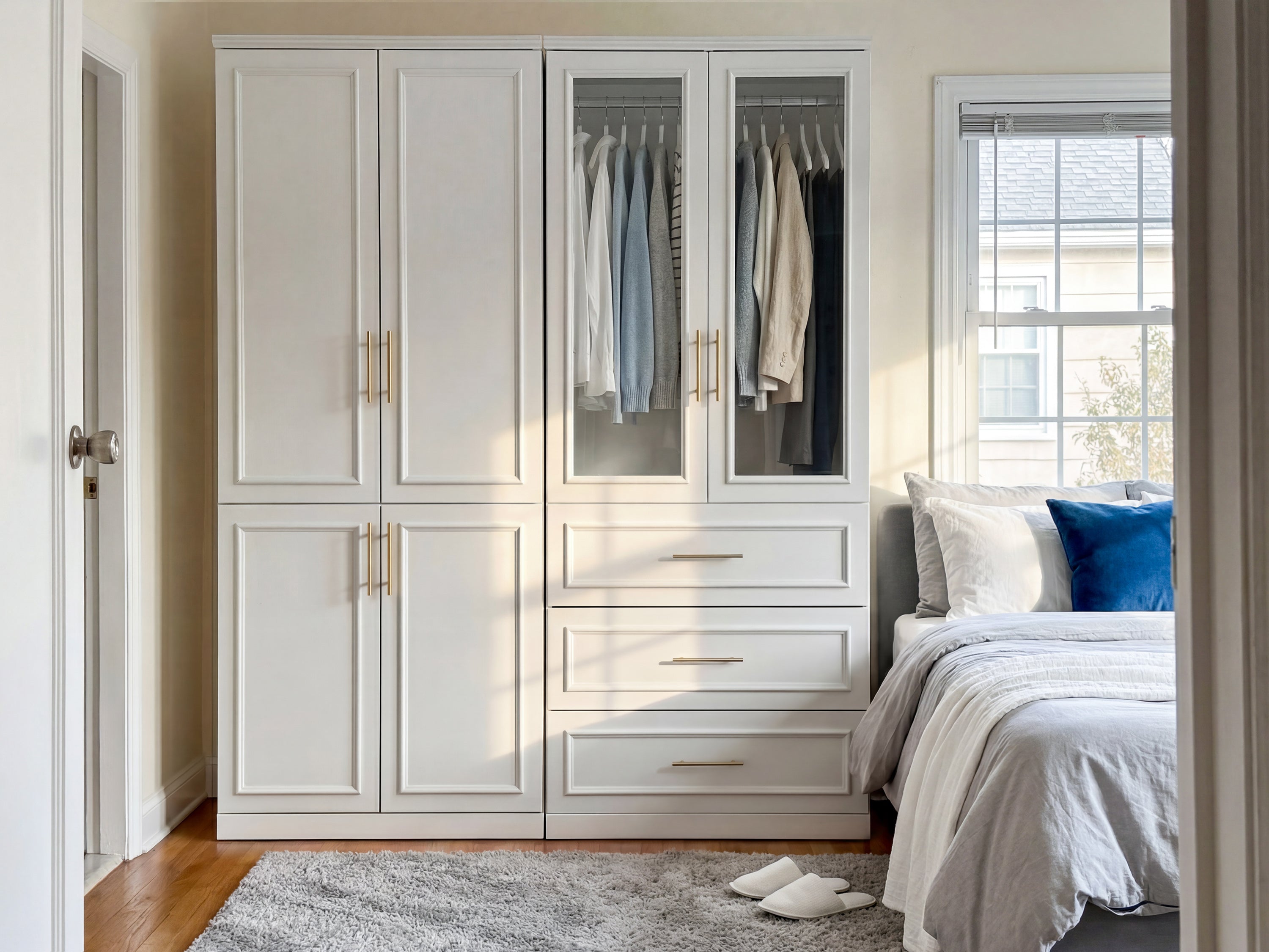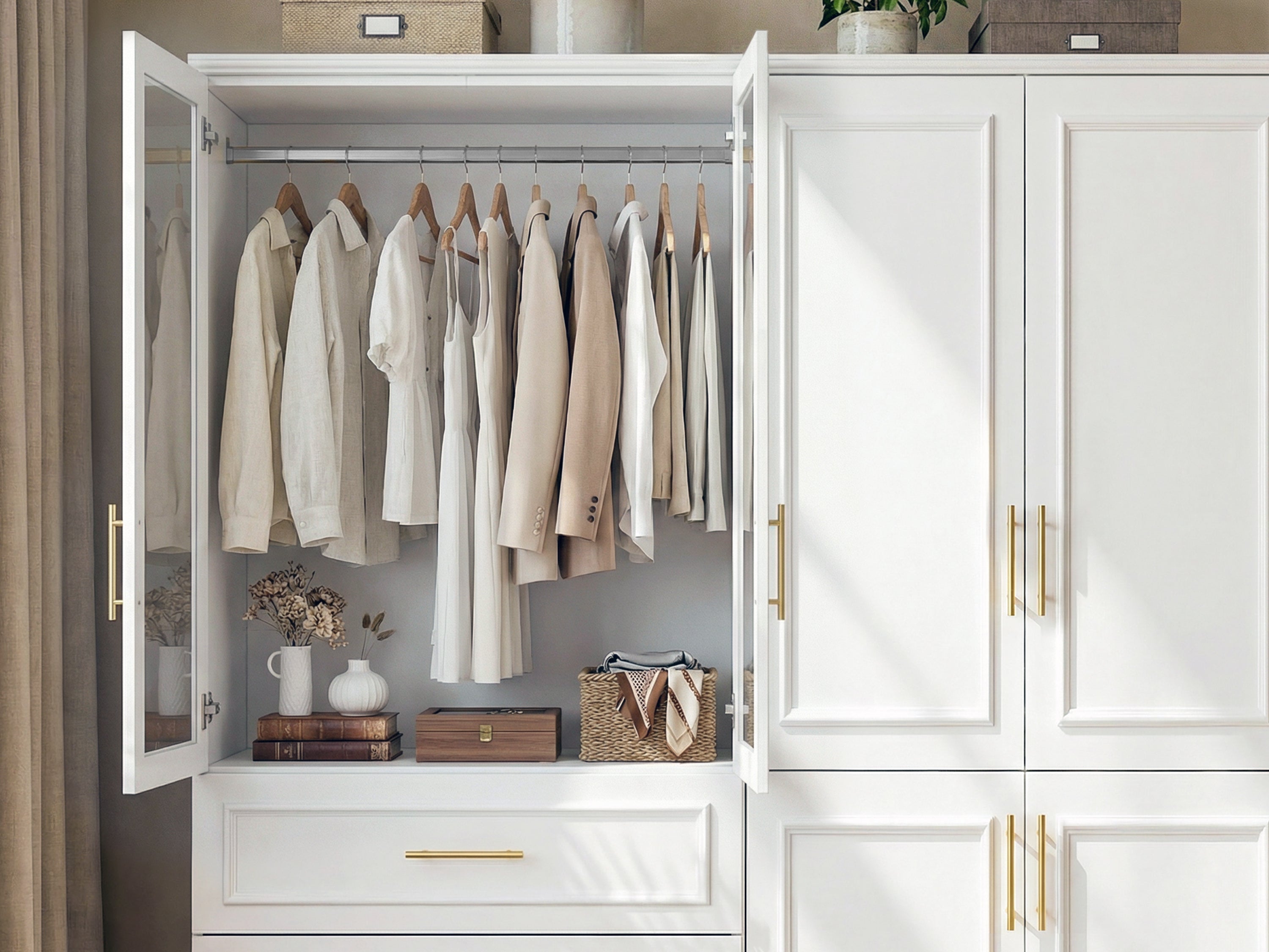 Upgrade your storage game with this Rena Series 2-piece armoire set and fill your bedroom with glam style. Crafted from solid and engineered wood, each piece is designed to transform your bedroom or office into a functional, stylish space to organize your belongings. There's ample room for all your clothes, including a stacking area and hanging space. Three drawers, two clothes racks, and two shelves provide all the space you need for clothes, accessories, and shoes. A crisp white finish and gold hardware elevate the pair. Wall anchors are also included for extra safety and stability.