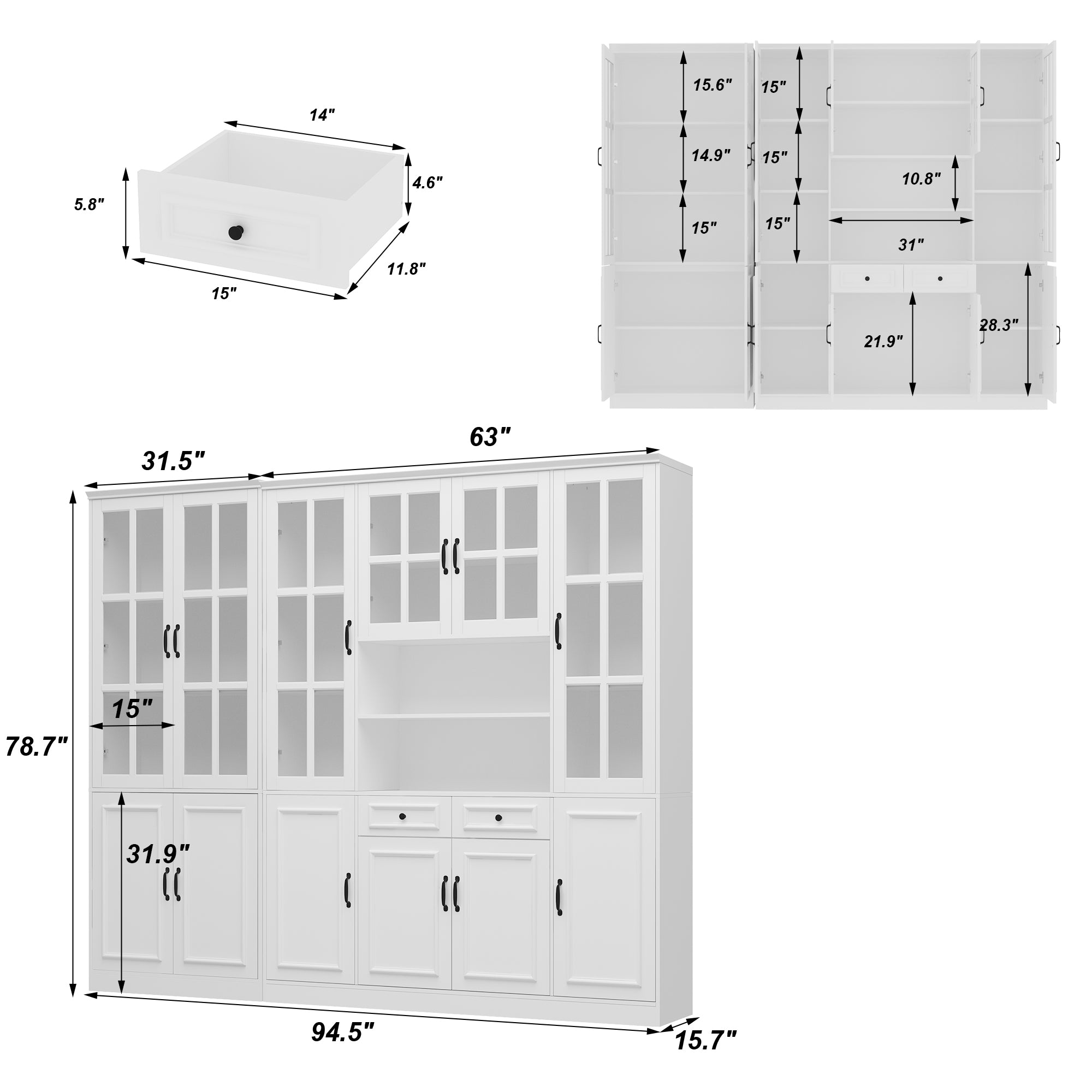 This display and book cabinet provides versatile storage solutions for your books, collectibles and daily essentials. Crafted from engineered wood with a white finish, it features seven clear tempered glass doors and seven opaque doors underneath, offering ample space for your book collections, decorative artifacts, and small home accents. Inside, there are 24 adjustable shelves and two drawers with metal slides, ideal for organizing your reading materials, display pieces and miscellaneous items. The black iron arch pulls add a touch of contrast and modern style. Ideal for your living room, study or home office, this dual-purpose cabinet combines functionality with a sleek design. Plus, it includes a wall mount for added stability.