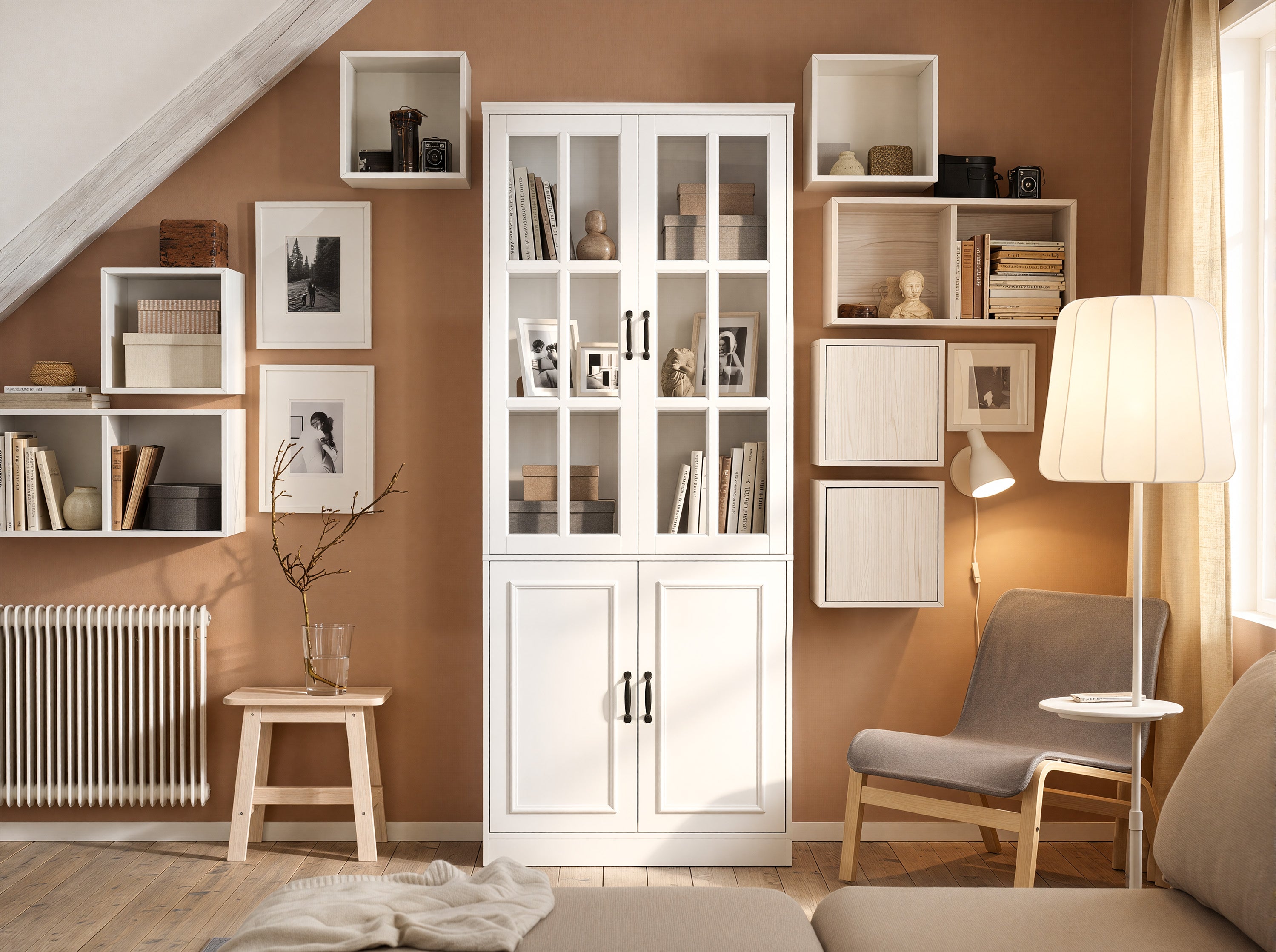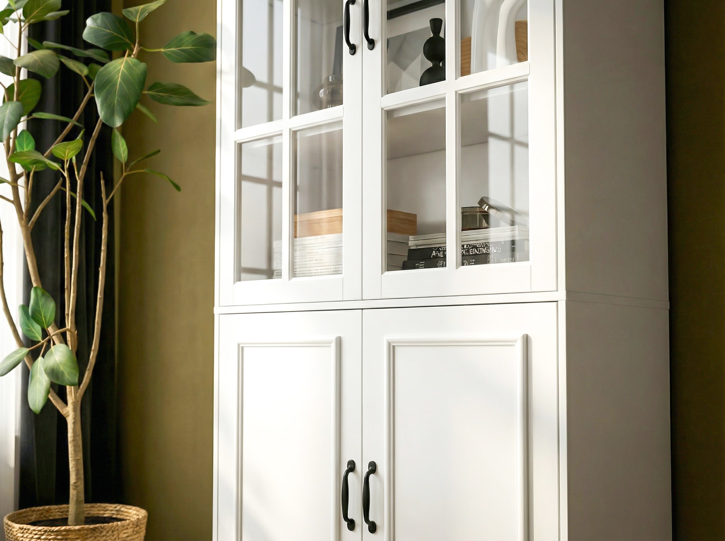 This bookcase transforms clutter into charming display space with glass doors that show off your books and decors. It's crafted from solid and engineered wood in a clean white hue that goes with a variety of color schemes. The design features a sizable, rectangular shape that's home to a wealth of storage options – the base has a cabinet with picture-frame doors, for tucking away clutter and the top half has three tiers of shelving with glass windowpane doors ideal for favorite sculptures, books, and houseplants. Curved metal handles complete the classic-yet-modern aesthetic of this storage cabinet.