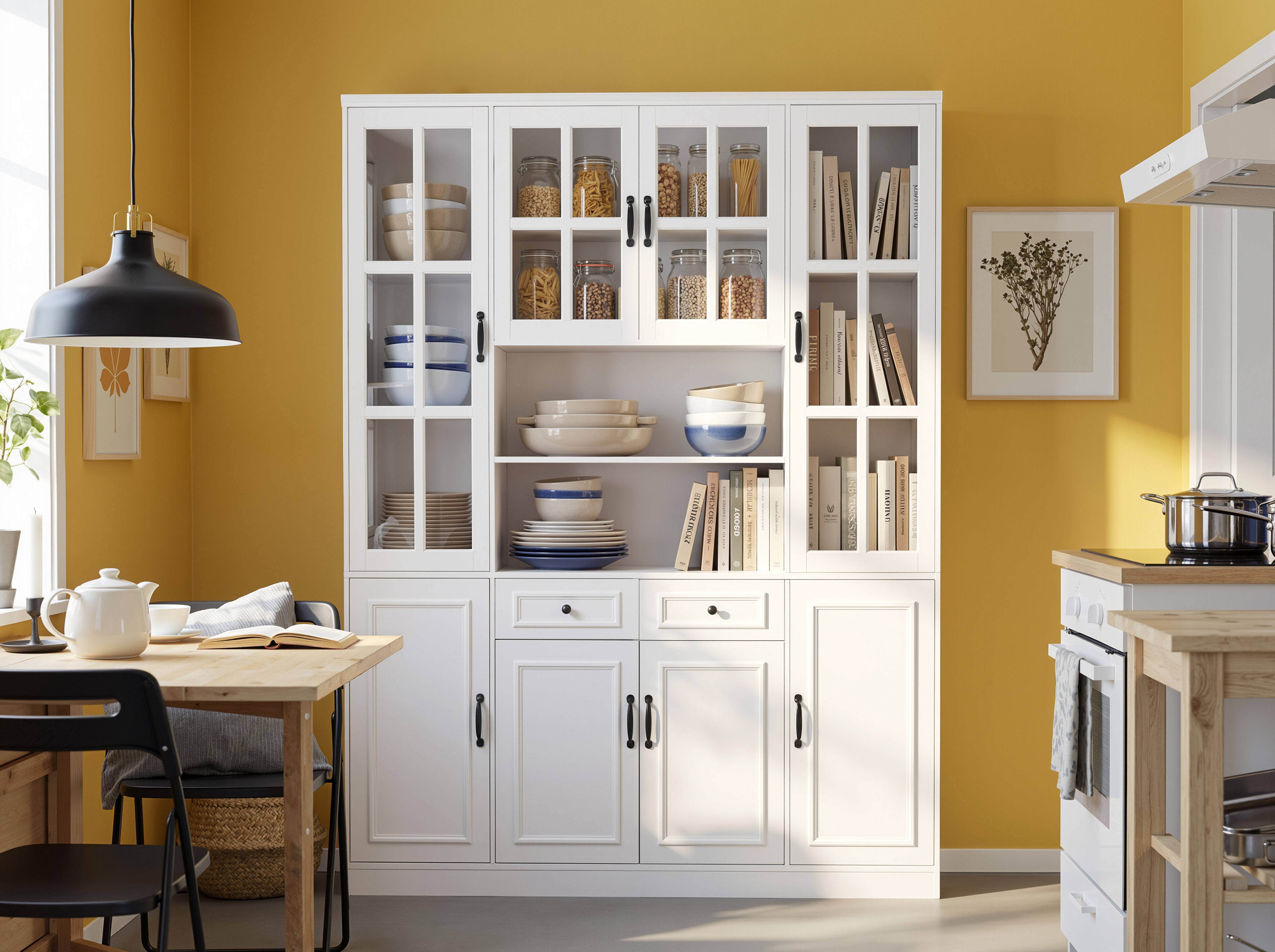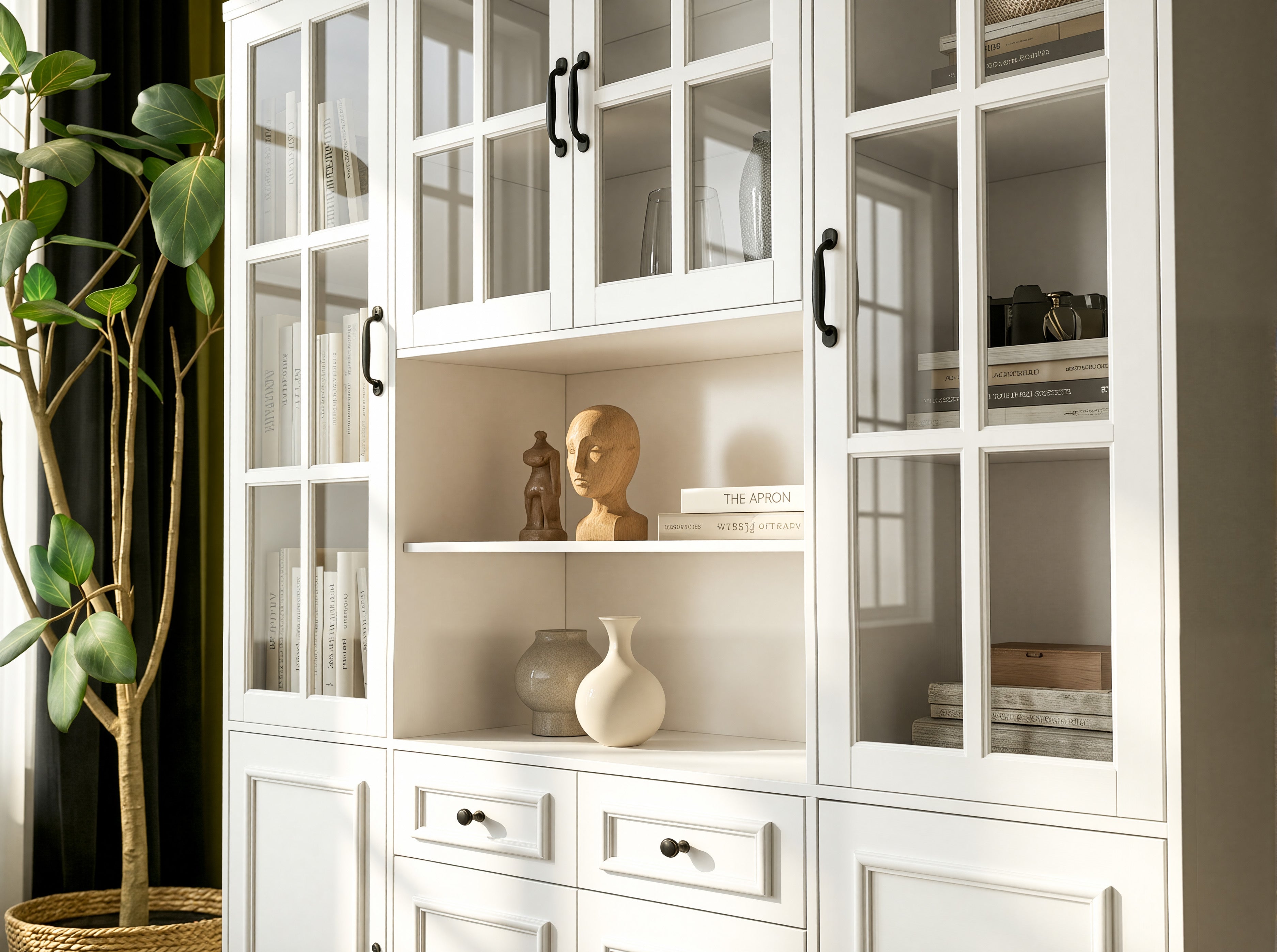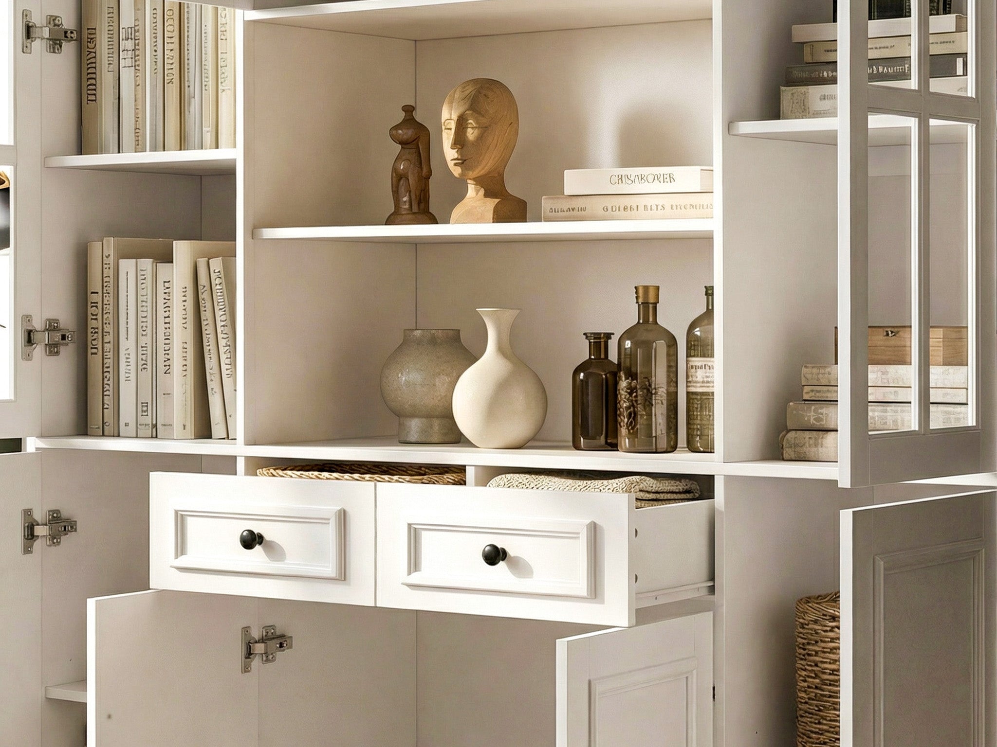 The sleek and modern bookcase, designed to complement any home or office space with its elegant white finish. This versatile bookcase combines functionality with style, featuring a top section with four transparent glass doors and two open shelves measuring 31'' W x 10.8'' H, perfect for displaying your favorite books, decor, or collectibles. The bottom section offers ample storage with two spacious drawers and four closed cabinet doors, all adorned with stylish black handles for a touch of contrast. Built with stability in mind, the bookshelf includes a floor-standing base and an anti-tip device to ensure safety and durability. This beautifully crafted bookcase combines form and function, both for display and storage, whether you are organizing your living room, bedroom or workspace, this bookshelf is the perfect combination of practicality and aesthetics.