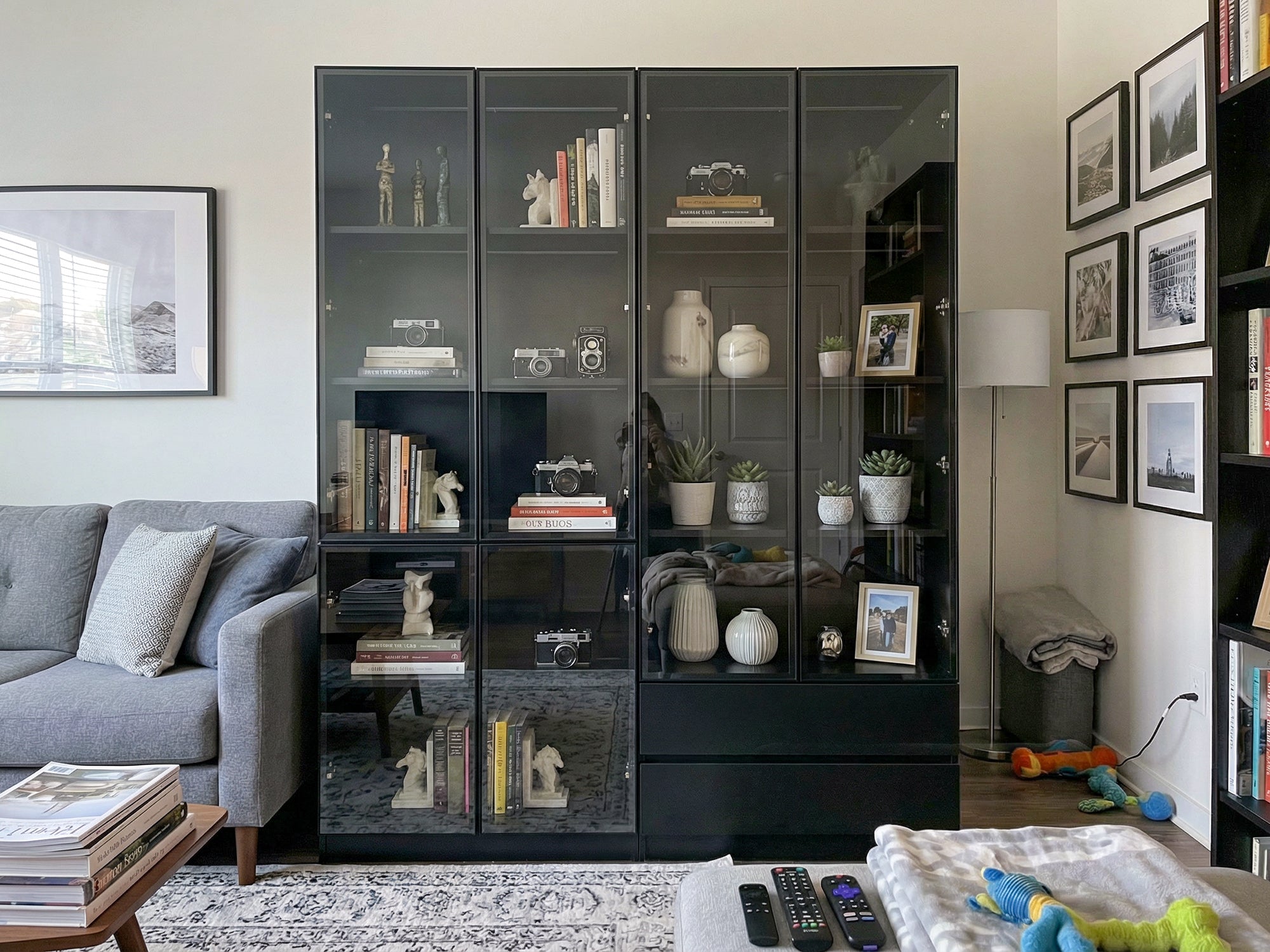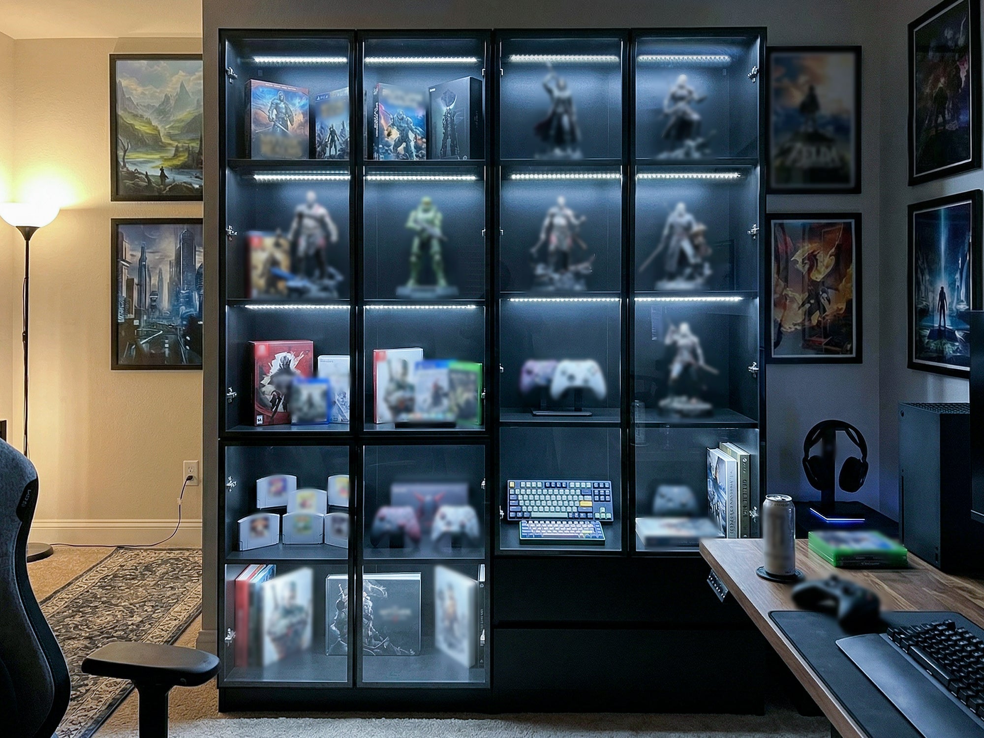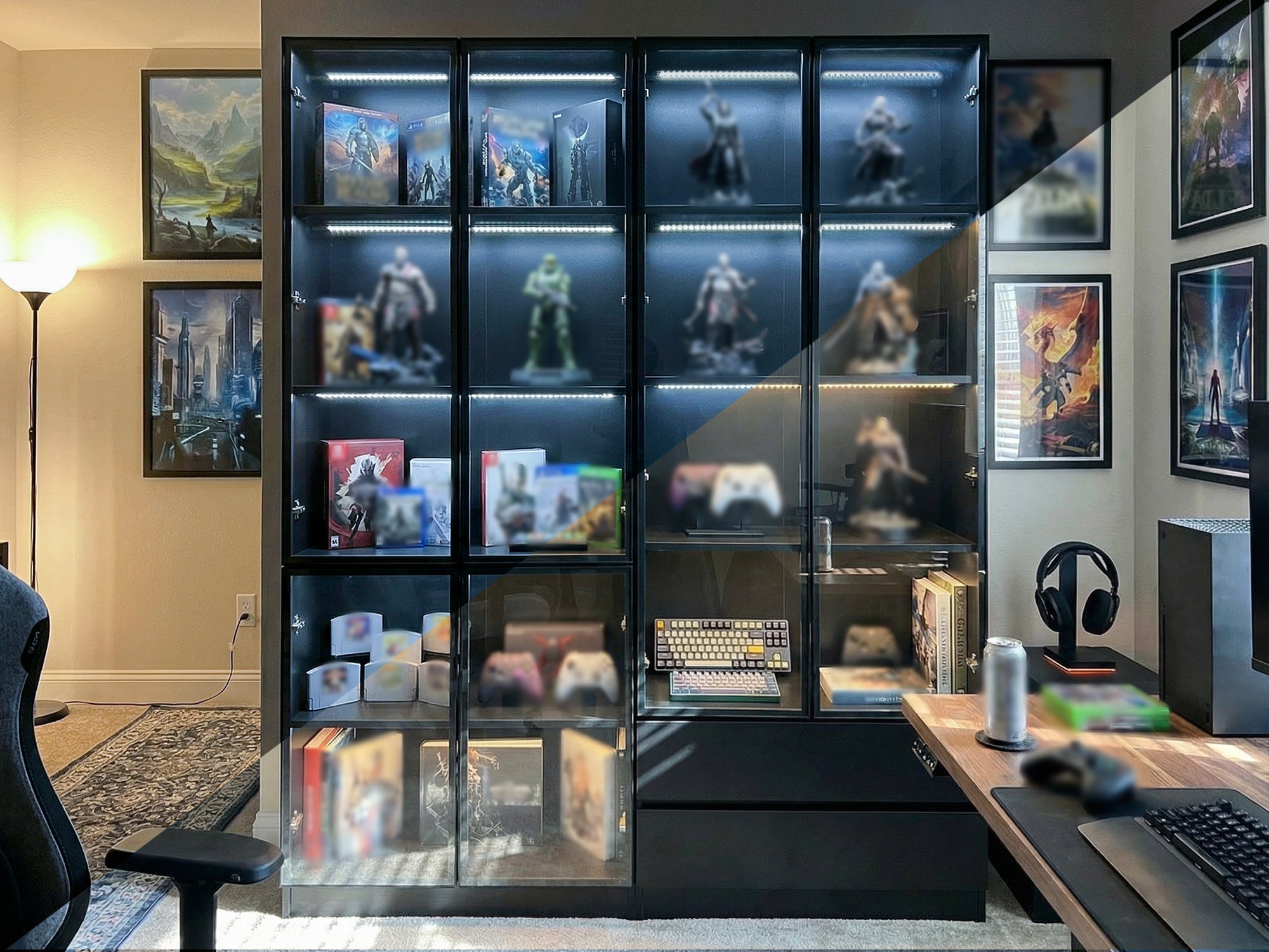 63 inch Modern White/Black Tall Bookcase with 3-Color LED Lights & 4 Glass Doors
