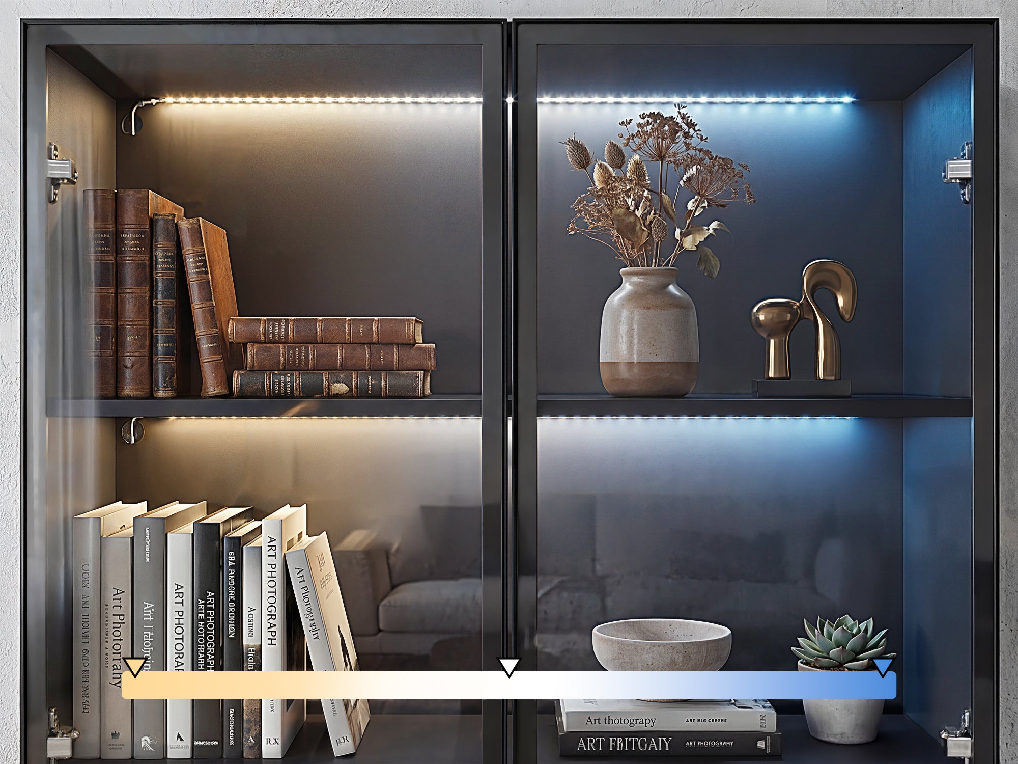 79 inch Modern White/Black Bookcase with Glass Doors and 3-Color Changing Lights