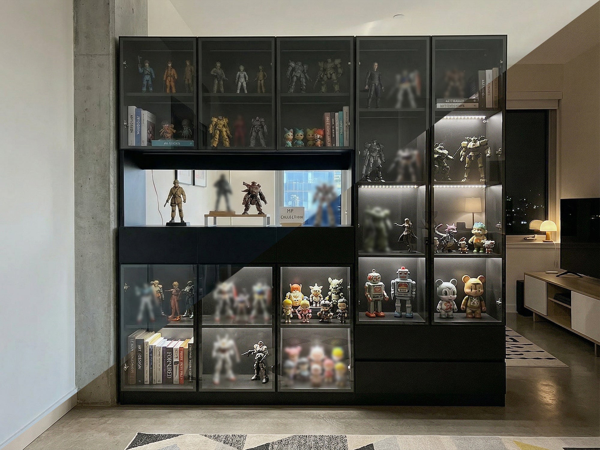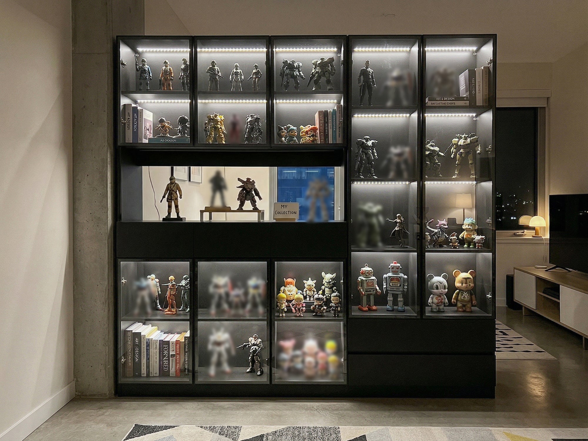 Perfect for your bedroom, living room, game room or home office, this multifunctional media tower offers plenty of storage space for your favorite DVDS, CDS, games, books, media and more. Features 8 clear glass doors, five drawers and an open countertop. This luxury-style locker will become a must-have in your home, as it will help keep whichever room you put it in neat.