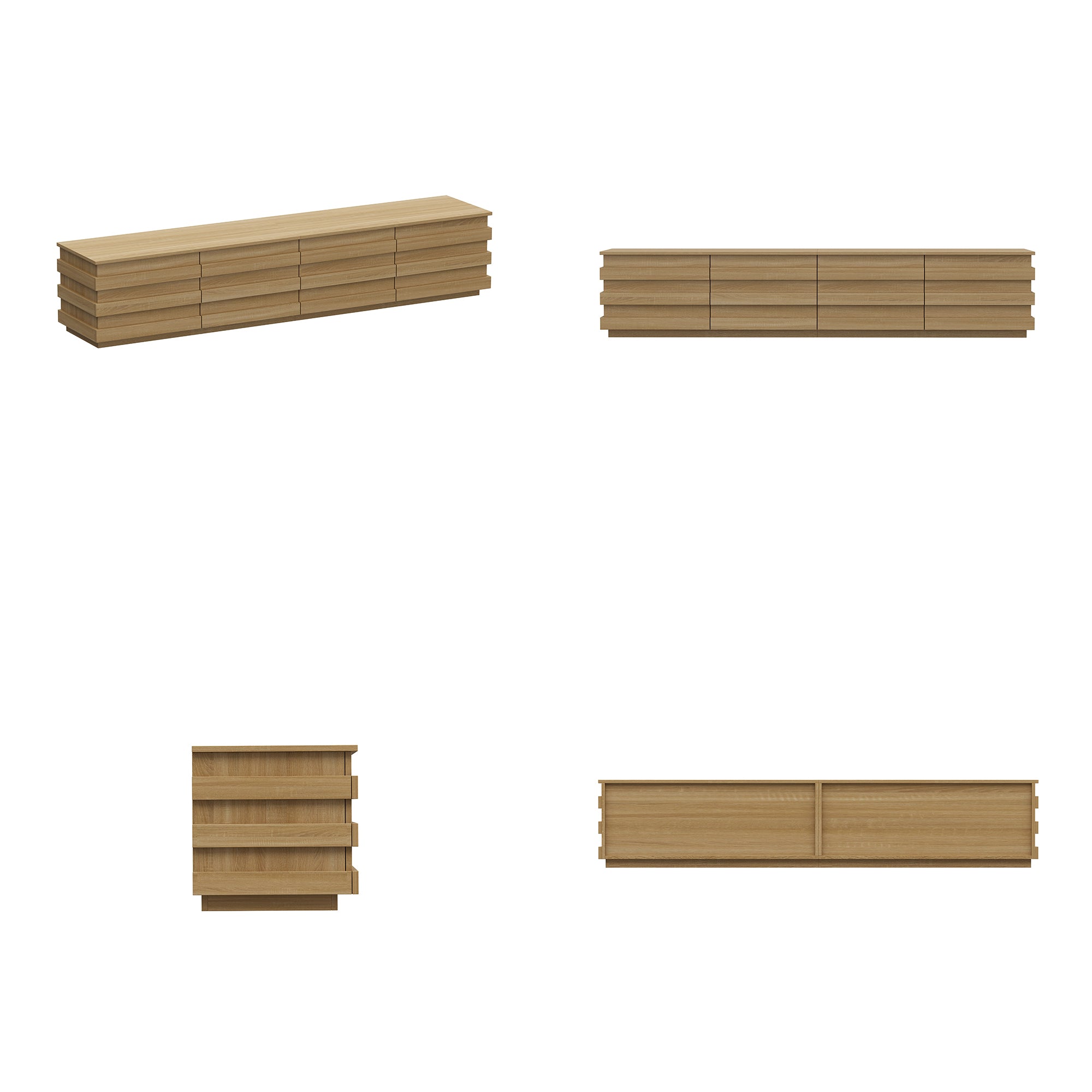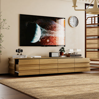 Enhance your living space with this modern wood TV stand, featuring a warm natural finish that brings a touch of simplicity and elegance to any home. Its low-profile and expansive design is perfect for accommodating large TVs and displaying decorative items, adding both style and functionality to your entertainment area. The layered horizontal panel design on the front adds a sense of depth and contemporary appeal. Equipped with four spacious drawers, this TV stand offers ample hidden storage for remote controls, media devices, magazines, and other essentials, keeping your space tidy and organized. Crafted with clean lines and a sleek aesthetic, it seamlessly complements modern, minimalist, or Scandinavian interiors.