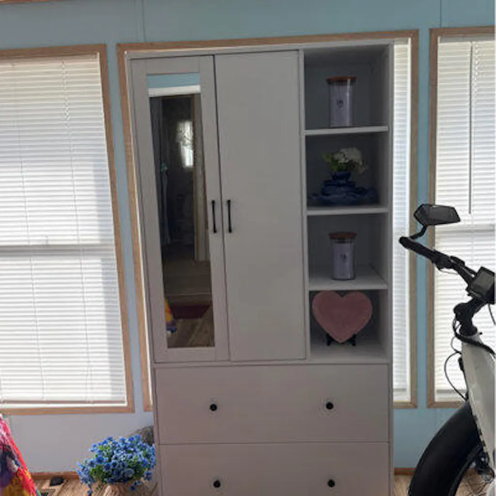This modern wardrobe is a perfect addition to your bedroom or living space, offering a smart combination of open and closed storage for your clothing and accessories. The wardrobe is finished in a sleek white tone, making it easy to blend with any decor. Featuring a scalable hanging rod that accommodates both short and long clothes, along with spacious drawers and shelves, this piece provides versatile and organized storage solutions. The mirrored doors not only add an aesthetic appeal but also make it practical for dressing and styling. With multiple compartments for folding clothes, bedding, and accessories, this wardrobe ensures your space stays neat and tidy.