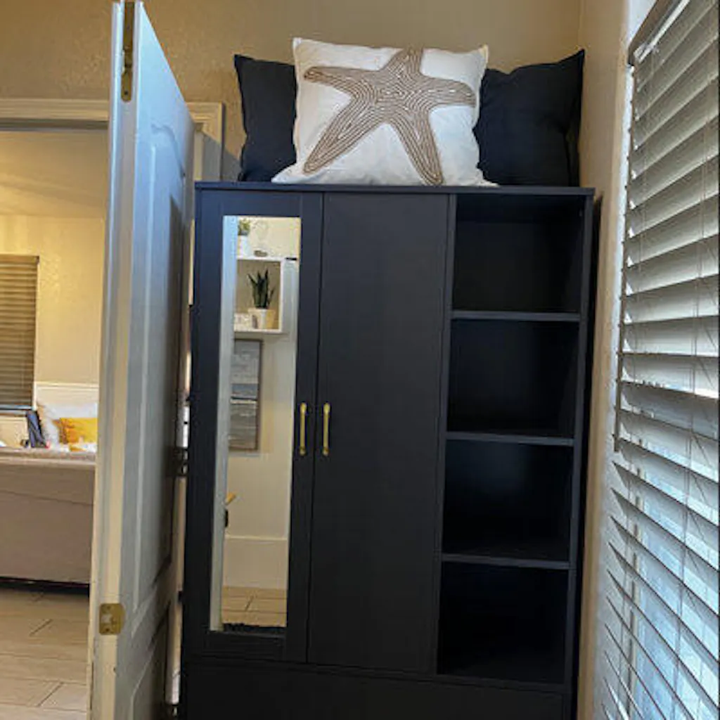 - Despite its compact footprint, this wardrobe offers generous storage. The thoughtful design maximizes space efficiency, providing all the storage you need without taking up too much room. Whether in a small bedroom or apartment, this wardrobe makes the most of your available space, offering a stylish and organized storage solution.