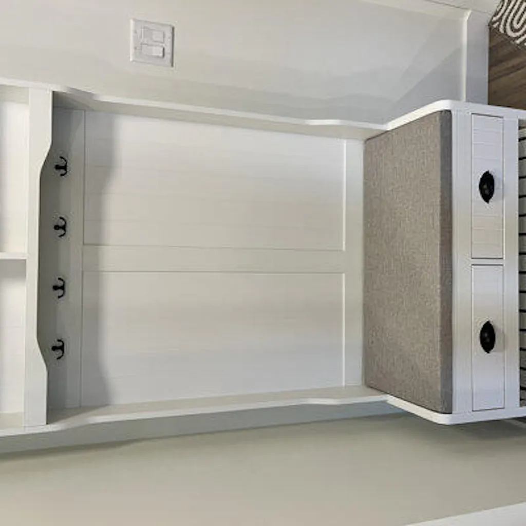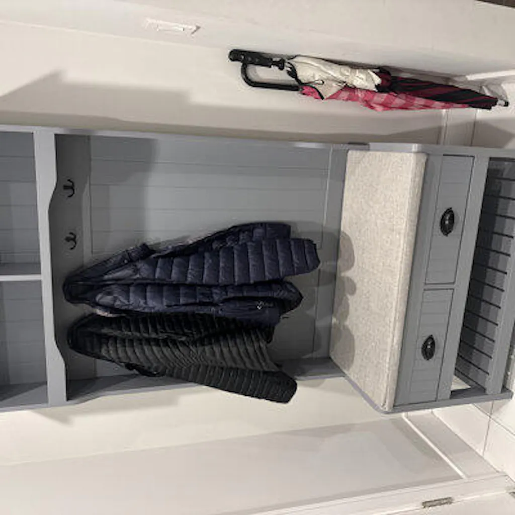 - Equipped with bench, hooks, drawers, and open shelves, providing ample and organized storage space.