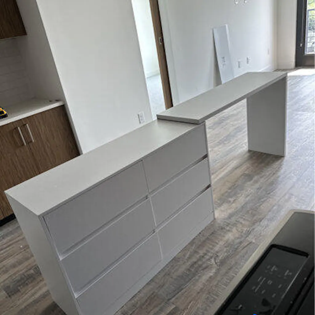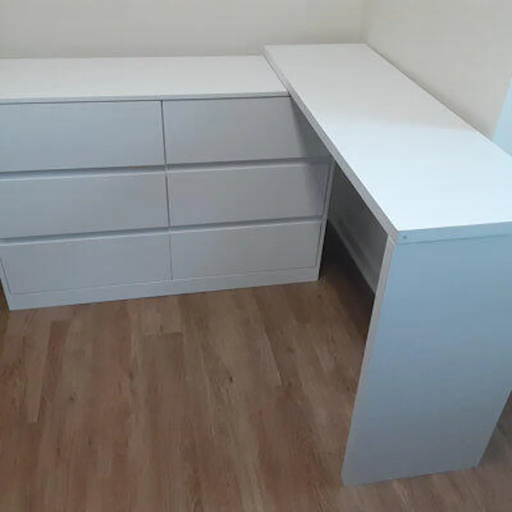 This 6-drawer double dresser and simple vanity desk set have a streamlined look that elevates your modern décor. It's made from engineered wood with a white finish that goes with nearly any existing color scheme. The dresser has six drawers to provide a place for everything from sweaters to denim. Handleless drawers and a solid apron base complete the contemporary feel of this dresser. We love that it comes with an L-shaped minimalist desk or vanity that pivots direction if you need it to. Bonus: A wall anchor is included for extra stability.