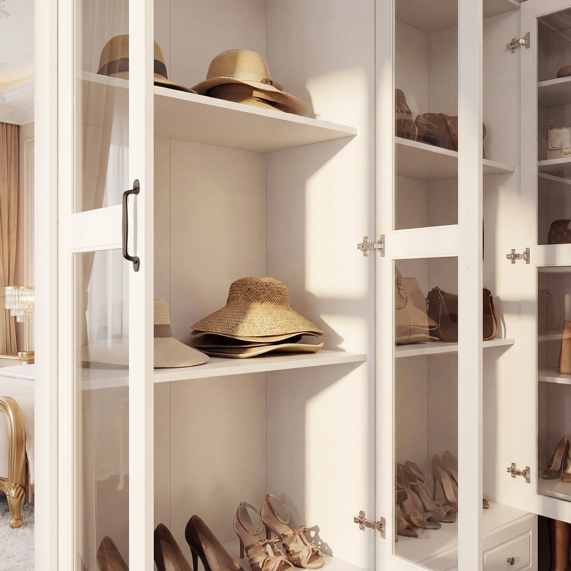 - It features six large shelves and eight drawers, offering expansive and versatile storage for your handbags, jewelry, perfumes, shoes, and accessories.