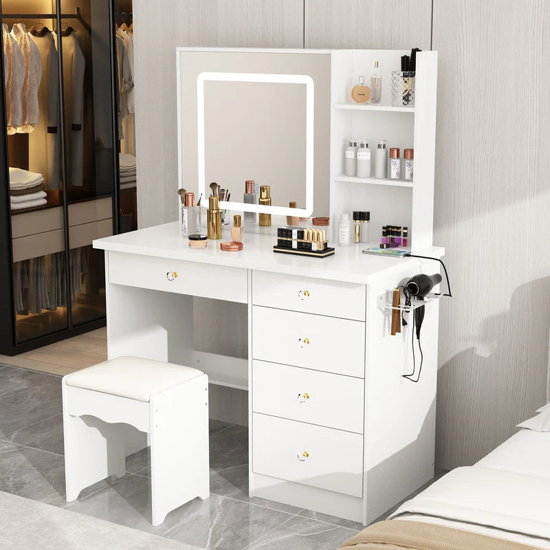Modern Vanity Desk With Mirror, 5 Drawers, Shelves And Matching Stool, Makeup Dressing Table